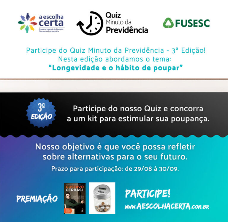 O Quiz Minuto da Previdência, do Programa A Escolha Certa, chegou a sua terceira edição, com o tema “Longevidade e o hábito de poupar”. Para participar, basta clicar aqui, assistir