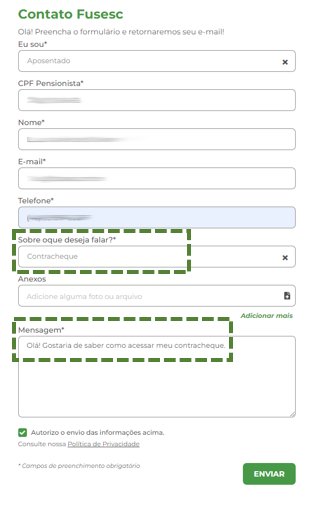 Preencha os dados, selecione o assunto sobre o qual deseja falar (neste exemplo, foi selecionado o item Contracheque) , descreva a sua solicitação no campo Mensagem e clique em “Enviar”: