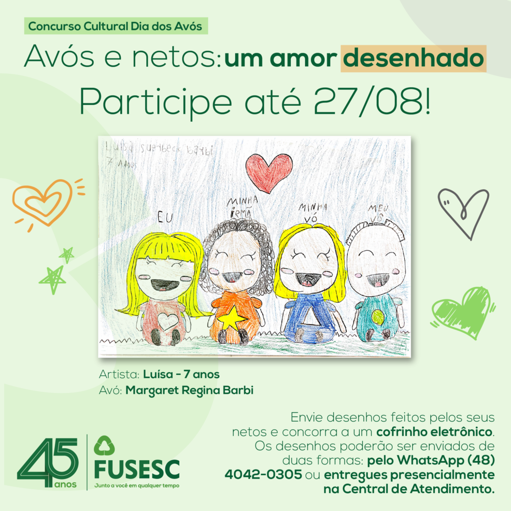 Envie desenhos feitos pelos seus netos e concorra a um cofrinho eletrônico! Os desenhos poderão ser enviados de duas formas: pelo WhatsApp (48) 4042-0305 (selecione o item 10 do menu – Concurso Dia dos Avós) ou entregues presencialmente na Central de Atendimento.