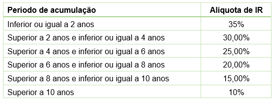 Alíquotas do IR, que incidem sobre o valor do benefício, diminuem ao longo do tempo, variando de 35% a 10%, à medida que o prazo de acumulação de contribuições ao Plano aumenta, conforme tabela; |